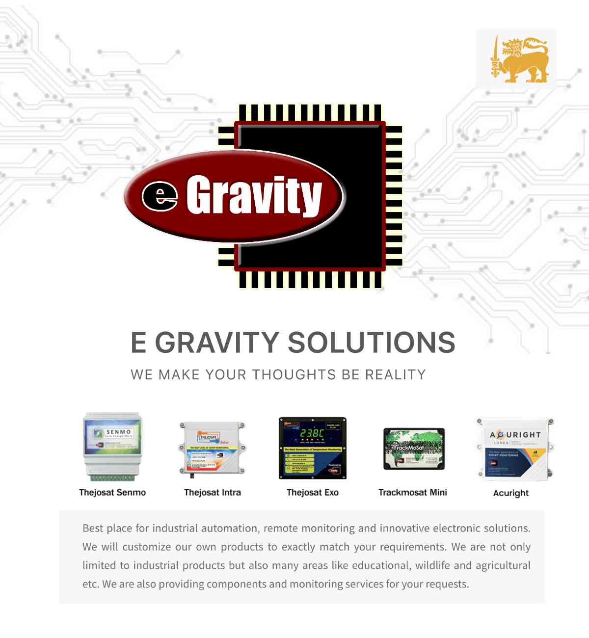 E Gravity Solutions is a pure Sri Lankan company established in 2009 to energize the Indigenous Technology & Know-How in the fields of Embedded Systems, Power Electronics, Industrial Automation and Electrical Engineering. Egravity Solutions provides you wide range of electronic, electrical & software solutions to enhance the productivity, efficiency and security of the various application environments.